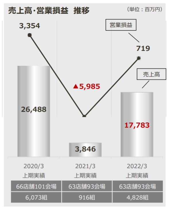 テイクアンドギヴ・ニーズのコロナ前2020年3月期第2四半期の婚礼単価は391万1,000円でした。2022年3月期第2四半期は347万円と44万1,000円(11.3%)減少しています。平均人数は69.4人から48.4人へと21.0人(30.3%)縮小しています。結婚式は人数や単価が減ったとしても、打ち合わせやオペレーションに関わるスタッフの人数や時間は変わりません。すなわち、少人数の施行組数が多くなればなるほど利益が圧迫されてしまうのです。