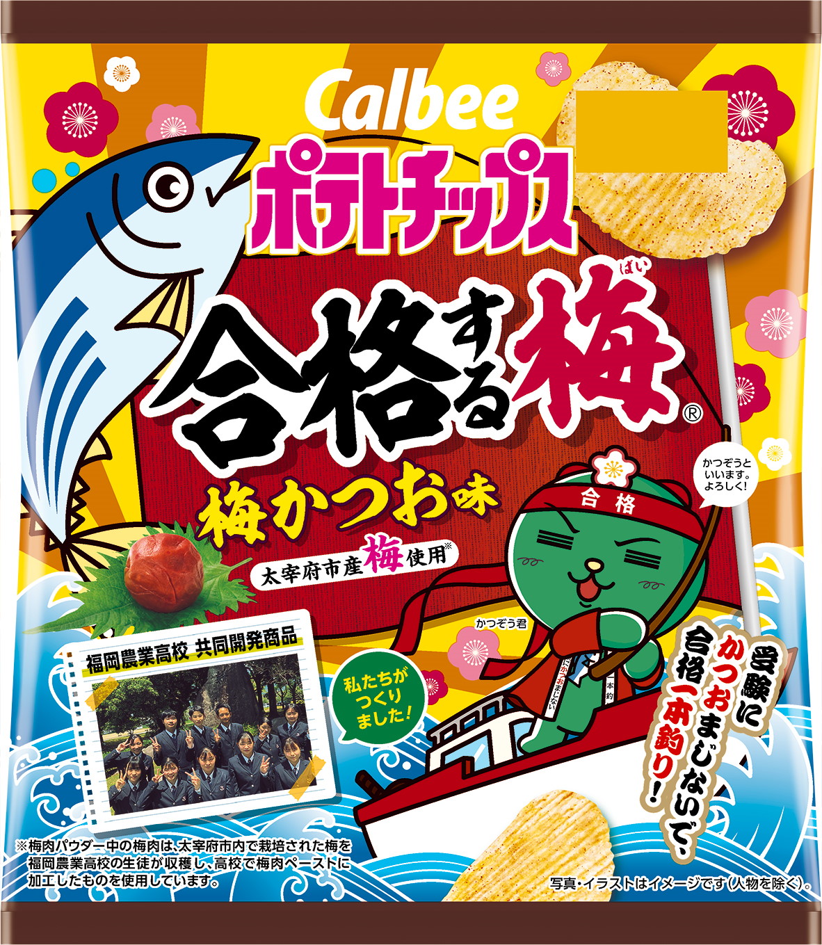 カルビーは2021年12月13日に、福岡農業高等学校と共同で開発した受験生を応援する厚切りのポテトチップス「ポテトチップス合格する梅(ばい)梅かつお味」を、中国、四国、九州で発売する。