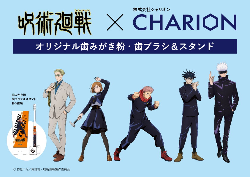 シャリオンは呪術廻戦主人公の虎杖悠仁をはじめ、伏黒恵や釘崎野薔薇、七海建人、五条悟といった主要キャラクターを配した歯ブラシ・スタンドセットと歯みがき粉を発売する。