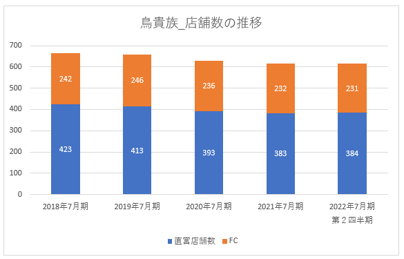 この違いを生んでいる要因の一つに、フランチャイズ加盟店と直営店の比率があります。鳥貴族の方がフランチャイズ比率が高く、家賃などの負担を軽減することができたと考えられます。