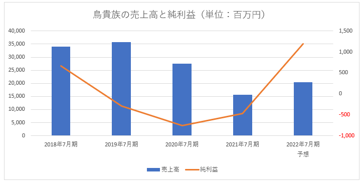 大庄は2022年8月期の売上高を367億1,200万円と予想しています。これはコロナ前の2019年8月期の39.8%減となる数字。鳥貴族は2022年7月期の売上高を204億2,300万円と予想しています。コロナ前の2019年7月期の43.0%減となる見込みです。