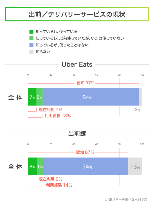 Zホールディングス傘下にあるLINE(新宿区)は、出前館が第三者割当増資を行う前の2020年12月に「Uber Eats」と「出前館」の認知率に関する調査を実施しています。それによると、「Uber Eats」の認知率は97%、「出前館」の認知率は87%でした。