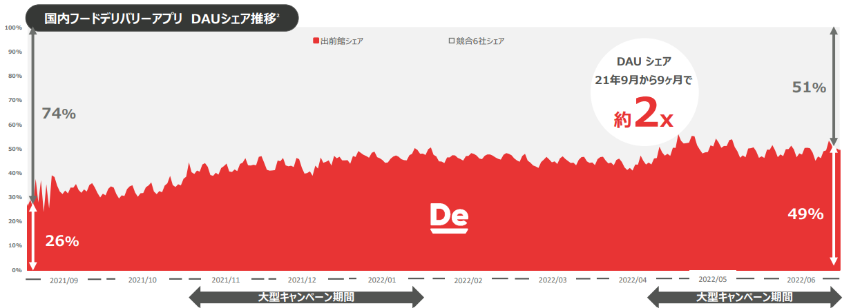 出前館は2022年6月時点で国内フードデリバリーアプリのDAUシェアが49%に達したと発表しています。