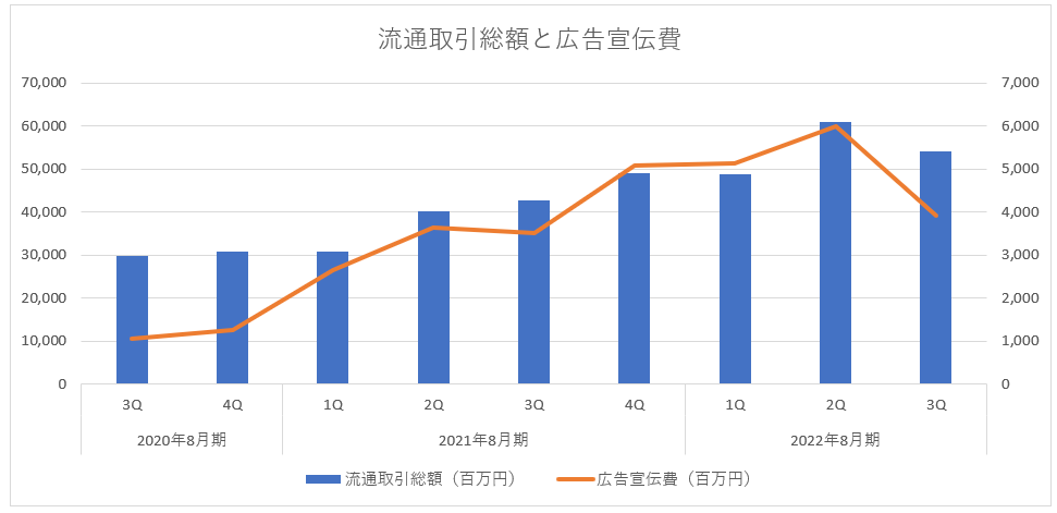 2022年8月期第2四半期は610億円となり、過去最高を記録しています。前年同期間と比較して1.5倍、第1四半期と比べて1.3倍に伸びています。しかし、第3四半期の流通総額は542億円。第2四半期と比較して11.2%減少し、急ブレーキがかかりました。