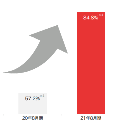 テレビCMの効果は大きく、出前館が独自に行ったブランド認知率調査では、2020年8月期に57.2%だった認知率は2021年8月期に84.8%まで、27.6ポイント上昇しました。