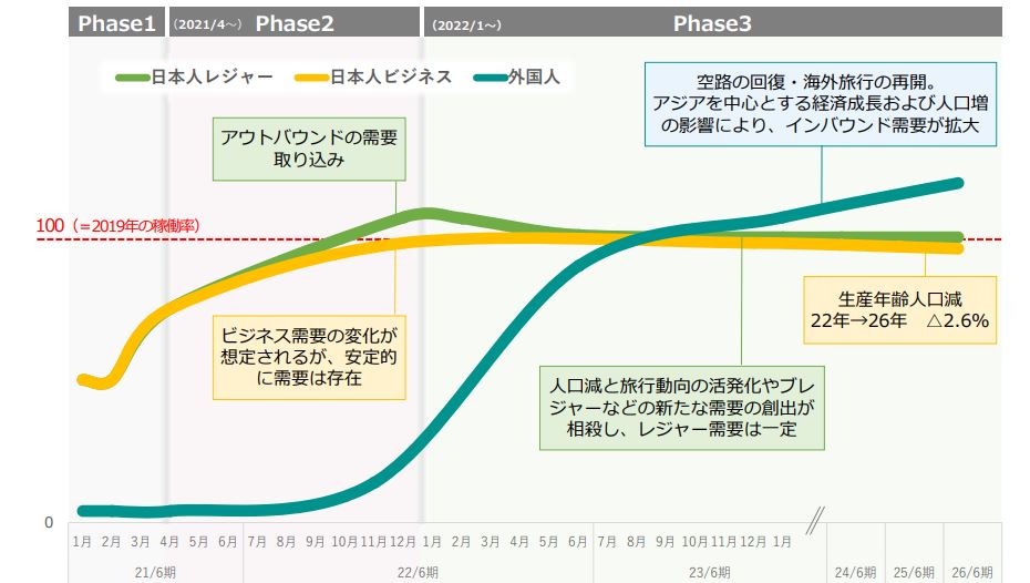 グリーンズは日本のレジャーが2021年10月、ビジネス需要が2023年1月、インバウンドが2023年8月ごろに回復すると予想しています。