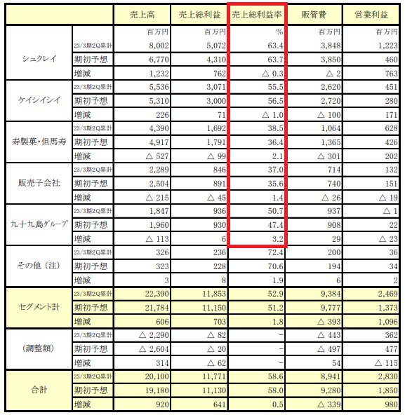 寿スピリッツは、子会社シュクレイが売上高の4割を稼いでいます。シュクレイは東京や大阪などの都市部を中心に「東京ミルクチーズ工場」「ザ・メープルマニア」「ココリス」などのブランドを展開しています。シュクレイの売上総利益率(粗利率)は63.4%。