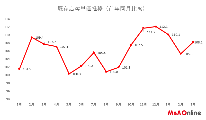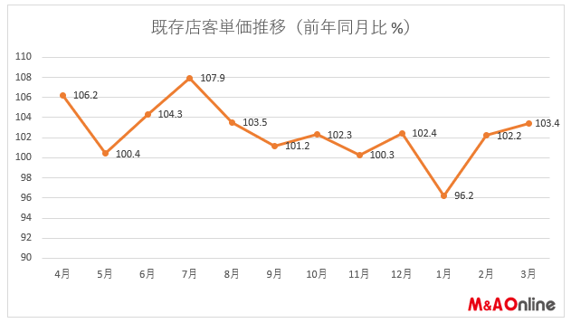 ただし、値上げによる客単価への影響も限定的でした。2022年7月の単価は107.9%まで上がっているものの、その後は下がっており、2022年8月から2023年3月までの客単価は平均して1.4%ほどしか上がっていません。