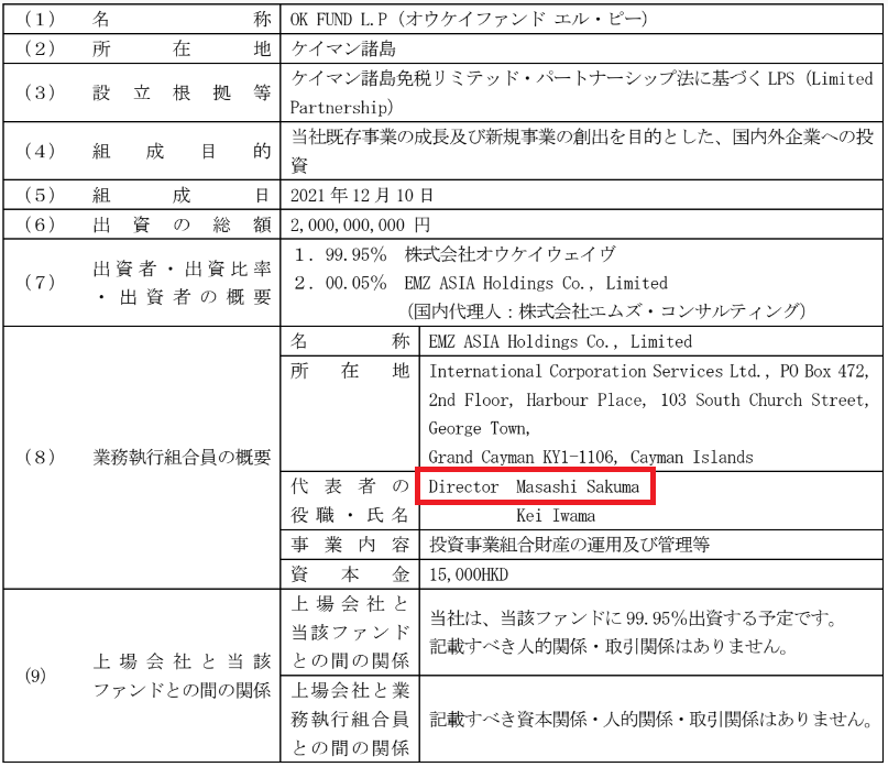 出資総額は20億円。オウケイウェイヴが99.95%、エムズ・コンサルティングが0.05%を出資しています。コーポレートベンチャーキャピタルの代表は佐久間将司氏です。