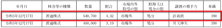 大量保有報告書によると、担保に差し入れた株式数は540,700。担保権は実行されており、許善政氏は一時4.32%を保有する筆頭株主となります。