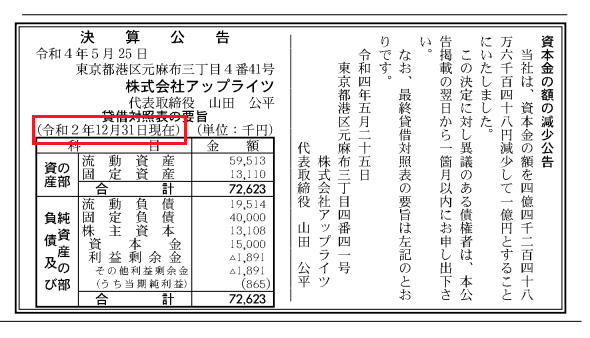 この減資も不可解な点が多いです。通常、減資は株主総会の特別決議が必要。当然、株主であるオウケイウェイヴがその意思決定に関わっています。しかし、公告で出されているアップライツの貸借対照表は2020年12月期のもの。本来は株主総会が行われた直前期である2021年12月期の貸借対照表を出さなければなりません。