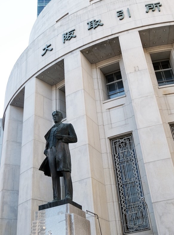 正面エントランスの前には大阪取引所の創設者、五代友厚の立像がいかにも颯爽と風を切るように立っている。商都大阪の水先案内人のようでもあり、明治期の資本主義経済の成長を支えた“東の渋沢、西の五代”といわんばかりの威容を誇る。