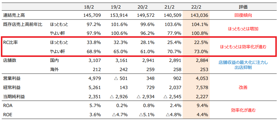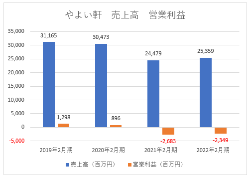 しかし、コロナ禍を機にやよい軒が重荷になります。ただでさえ、営業利益が出ていないうえ、やよい軒は2021年2月期に18億5,800万円、2022年2月期に14億9,100万円の減損損失を計上しています。2020年2月期は3億1,400万円の減損損失でした。