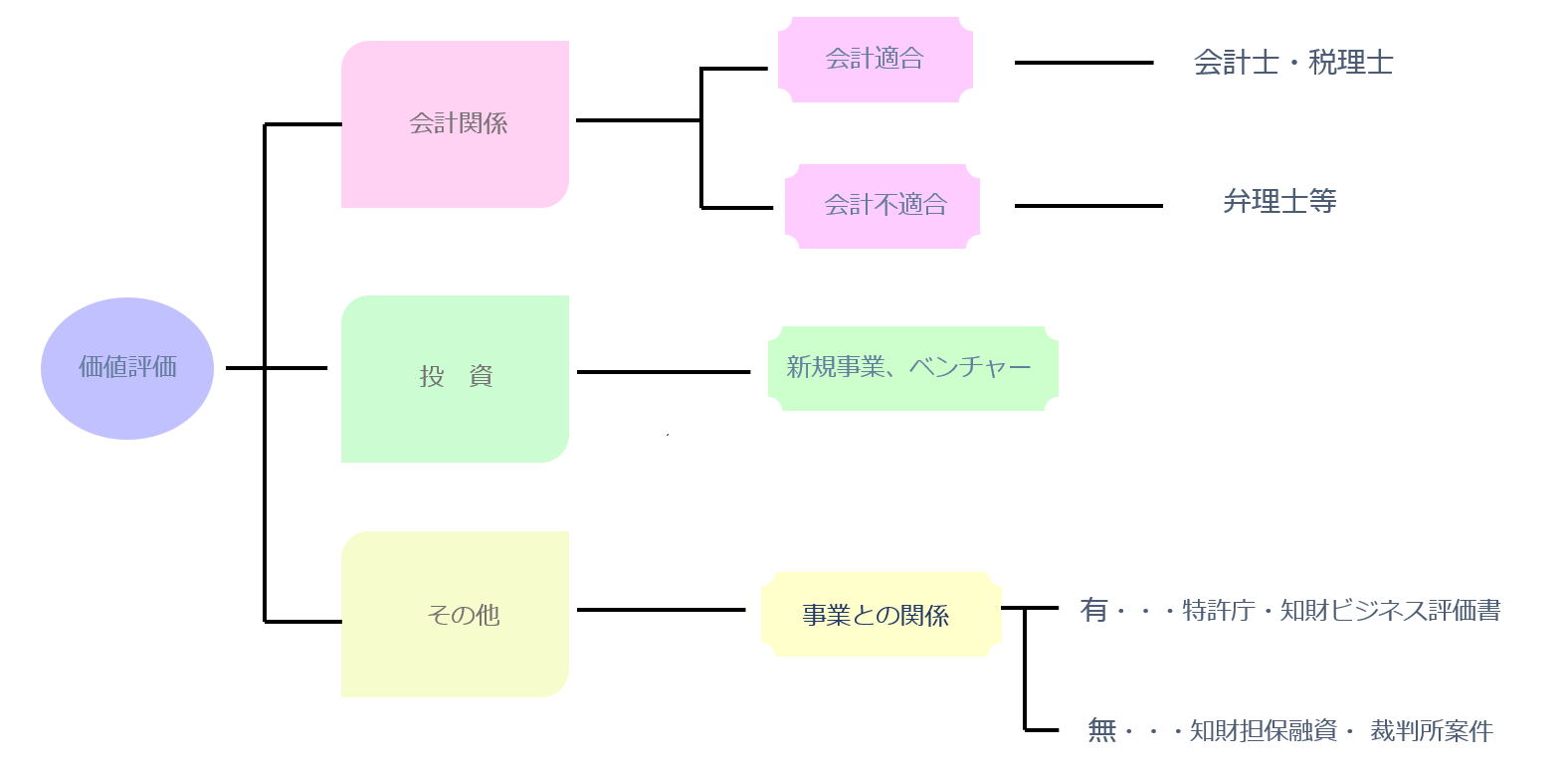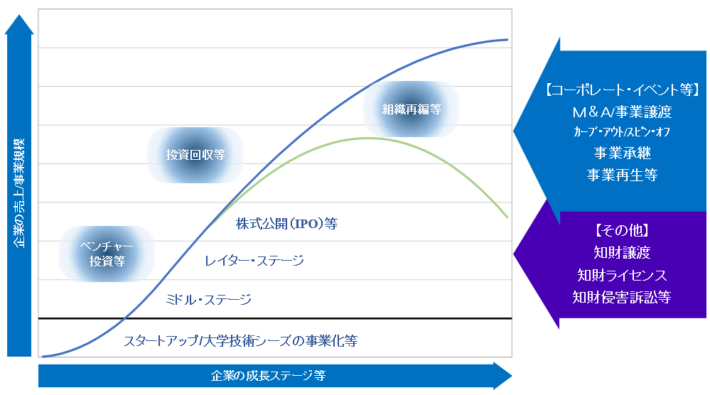 知財評価が求められる場⾯や知財評価の目的としては、企業の成⻑ステージに伴う投資・資本提携、エグジット・組織再編等や、M&A等のコーポレート・イベント、その他、知財侵害訴訟に係る損害額算定等、様々な局⾯があります。さらに、知財評価に関する調査解析目的・テーマも多岐にわたります。