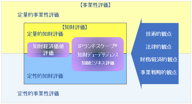 分析方法による大きな分類として、2種類の評価、つまり特許発明の内容等に係る定性的分析・評価、そして特許の出願件数・引用に係る文献数等、その他統計量に基づくスコアリング等や経済価値算定等による定量的分析・評価等が挙げられます。また、知財の価値の源泉は、基本的には事業利益等への寄与にあるとの考え方に基づき、技術的観点だけではなく、事業戦略的観点など様々な観点での知財の調査解析が求められます。知財評価が、事業性評価と表裏一体との密接な関係であるがゆえんです。