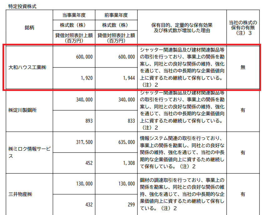 ストラテジックが特に問題視しているのが、政策保有株。文化シヤッターは取引先との関係を強化する目的で、複数の会社の株式を保有しています。その中でも資産価値が高いのが大和ハウス工業です。60万株、19億円分を保有しています。