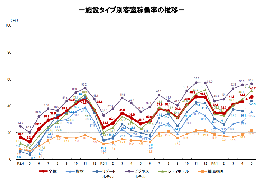 国内の観光需要も回復に向かっており、2022年5月の段階でリゾートホテルの客室稼働率は43.5%となりました。旅館も35.5%まで回復しています。