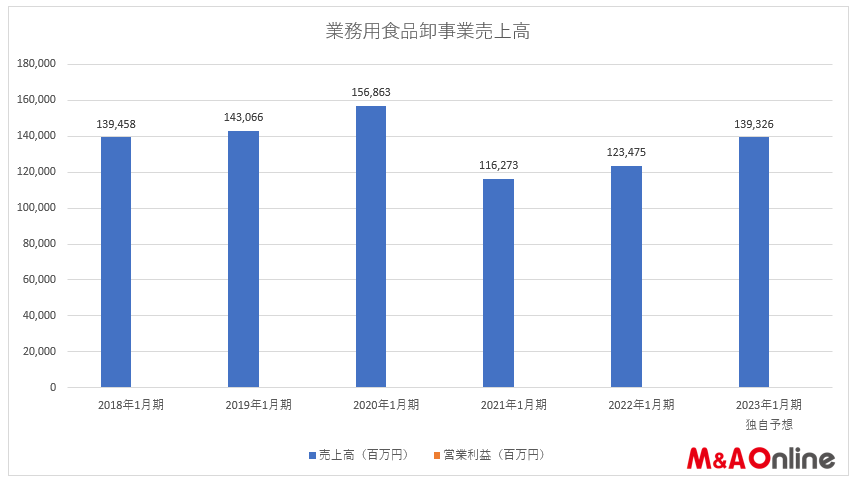 業務用食品卸事業は売上高全体の6割を占めています。過去5期の売上構成比率とトーホーの通期業績予想をもとに、2023年1月期の業務用食品卸事業の売上高を割り出すと、1,400億円程度になると考えられます。